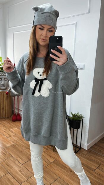 BY O LA LA...! DRESOWA BLUZA TUNIKA Z MISIEM SZARA